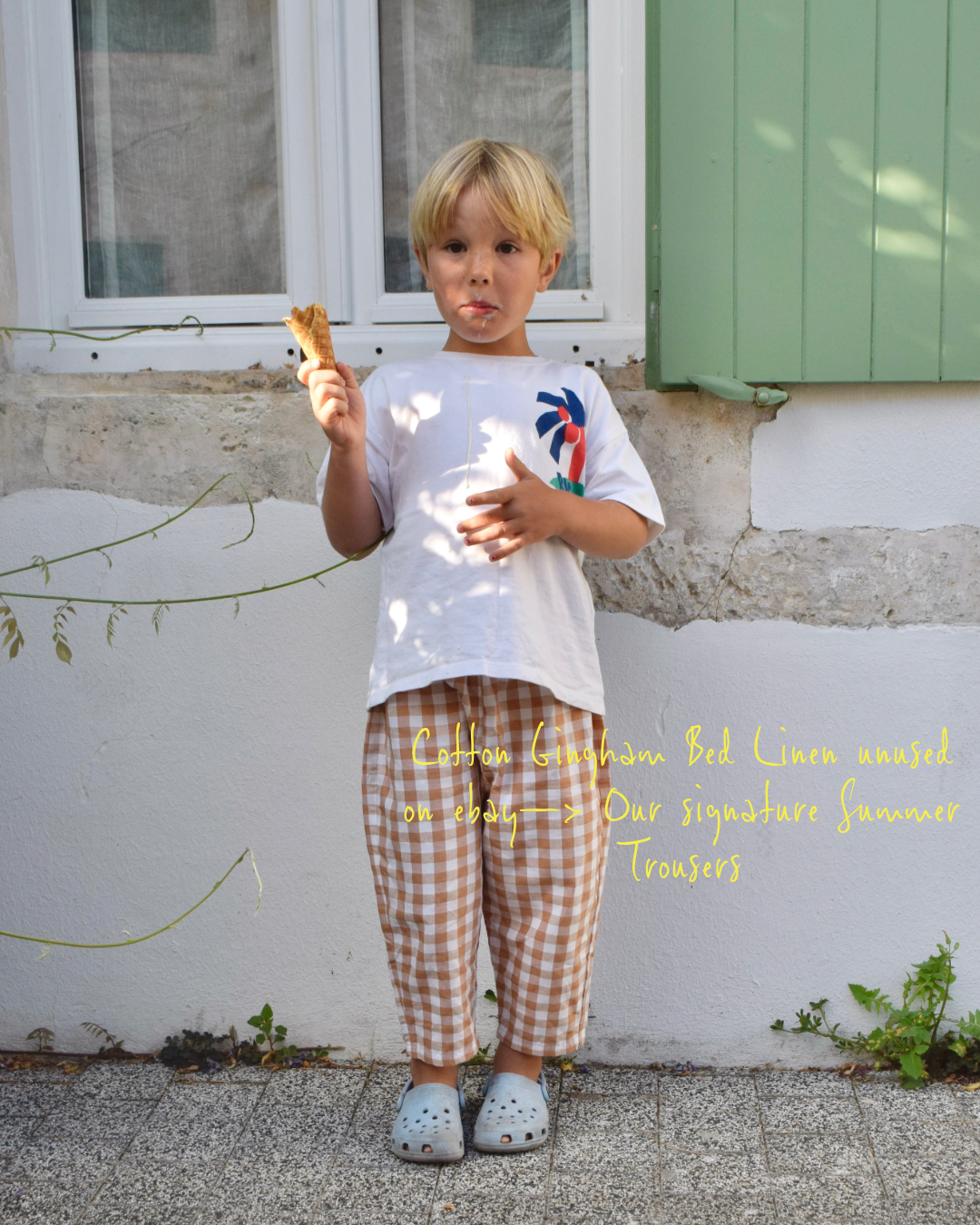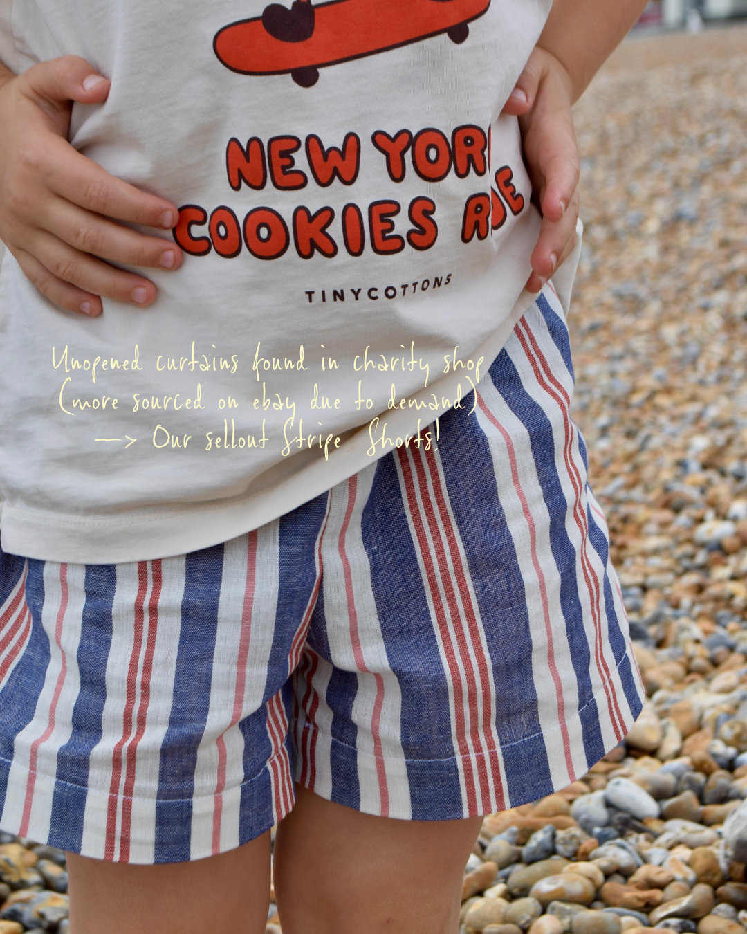 Our collections, all designed & made here from our Whitstable studio’s, include trousers, shorts, reversible gilets, hair bows and cushions. The designs evolve, but we’re always focussed on longevity, keeping the style simple, the fabrics unique. A favourite was turning vintage table cloths found in France into summer checked shorts. What shall we make next??