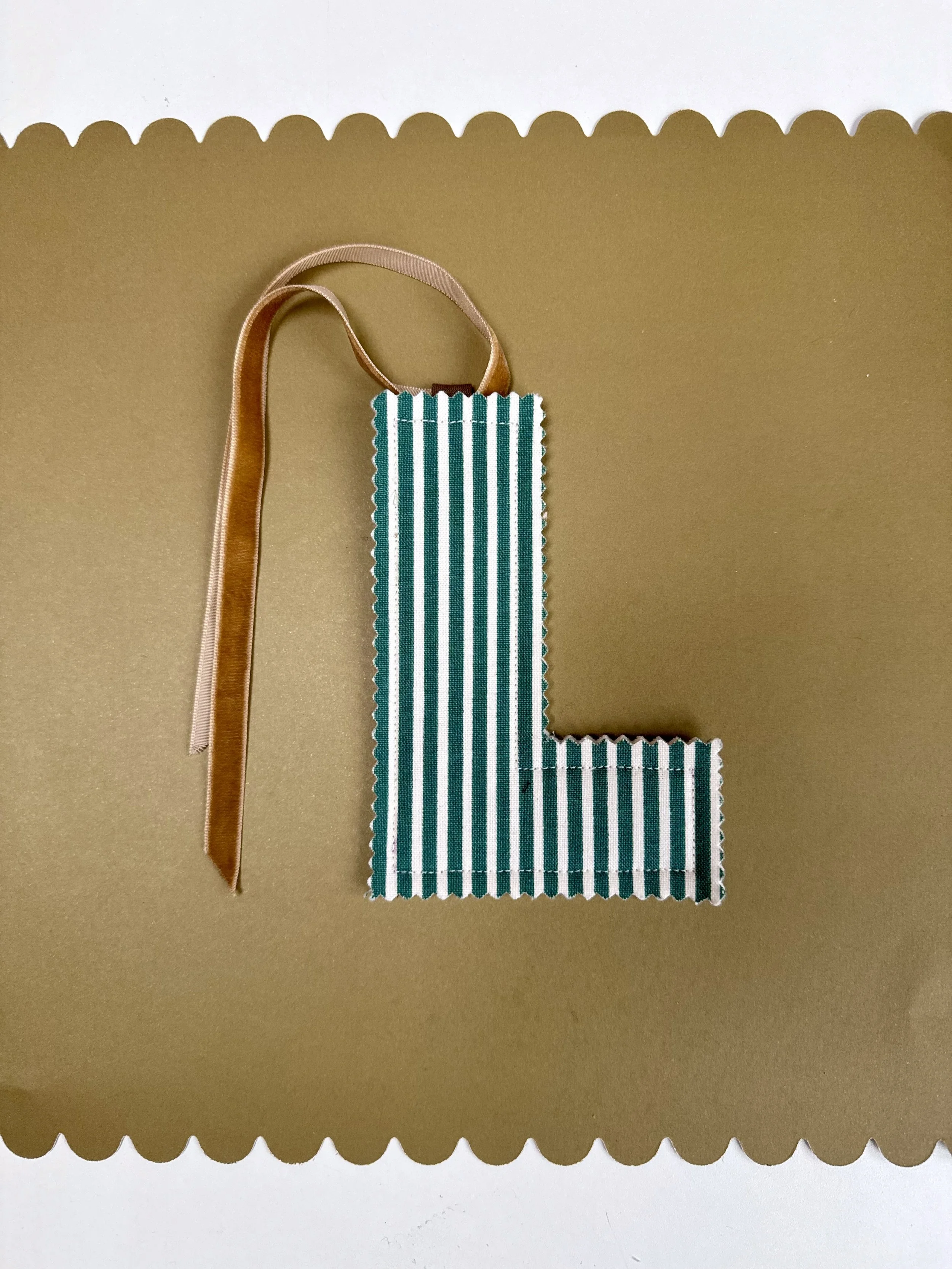 Handmade fabric letter ornaments which can be used as a tree decoration or hanging in Children’s Room. Each Handmade using off cuts from previous handmade projects including Merchant and Mills Linens.